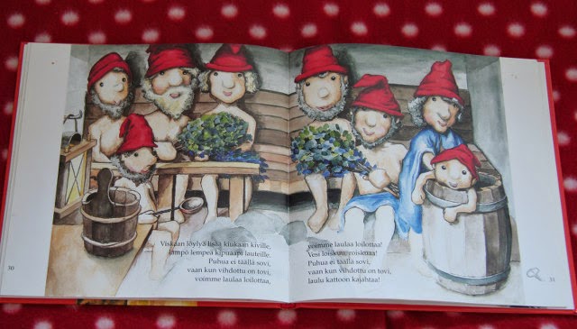 Tänään tonttu on menossa joulusaunaan (sormilla tontun askeleita).